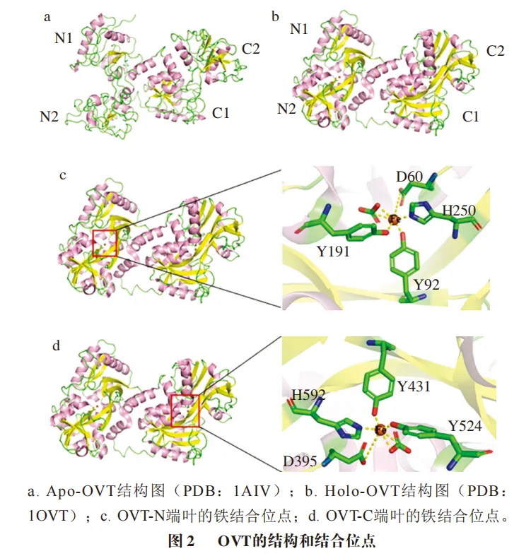 OVT是一种由686 个氨基酸和15 个二硫键组成的单链铁结合糖蛋白,糖基约占2%~6%,分子质量为77~80 kDa,不含游离疏基。在整体结构上,OVT由两个球状叶瓣组成,称为N端叶(残基1~332)和C端叶(残基342~686),它们通过9 个氨基酸残基(残基333~341)的α-螺旋连接,这些残基可以通过胰蛋白酶消化释放。15 个二硫键中有9 个位于C端叶,6 个位于N端叶。N端叶和C端叶通过非共价键和疏水相互作用结合,研究证明分离的N端叶和C端叶可以在溶液中重新结合。与其他同属于转铁家族的成员一样,每个叶可以进一步分为大小相似的α/β亚结构域(N1、N2和C1、C2),每个结构域有160 个残基;亚结构域由两条反向平行的β链连接,使得它们能够以铰链样机制打开和关闭。N端叶和C端叶的氨基酸序列具有37.4%的同源性,两个叶瓣的主要差异在于环状区域。天然的OVT分为两种形式:不含铁的(Apo-OVT)和与铁结合的(Holo-OVT),它们的三维结构由PubChem数据库(https://pubchem.ncbi.nlm.nih.gov/)查得,如图2a、b所示。