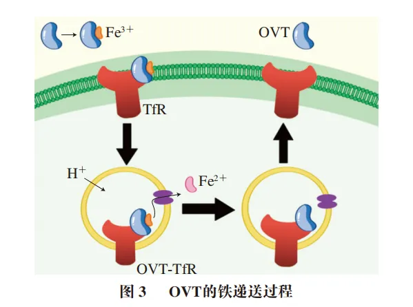 转铁蛋白家族的结构是为运输Fe3+而自然形成的,在结合和释放Fe3+前后,它们的结构会发生相应变化以适配Fe3+。基于转铁蛋白家族的铁递送过程,推测了机体中OVT运输铁离子的过程如下:OVT首先与Fe3+发生结合,随后,含铁的OVT与活性分裂细胞表面的OVT受体(TfR)相结合。此后,OVT-TfR复合物被细胞摄取并转运至内涵体。在此过程中,依赖ATP供能,H+被主动转运至内涵体。当内涵体内部的pH值降至5.5时,Fe3+从OVT中解离释放。与此同时,TfR在酸性环境下发生构象改变,但仍与Apo-OVT保持结合状态,直至该复合物重新回到细胞表面才发生脱离。Apo-OVT进入体液后,在肠道及血红蛋白分解部位再次与游离铁结合,从而开启下一轮铁离子运输循环(图3)。