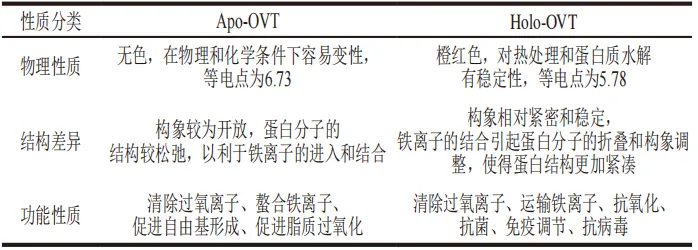 Apo-OVT与Holo-OVT的物理化学性质大有不同(表2)。Apo-OVT呈无色,在物理和化学条件下容易变性,结构更为松弛;而Holo-OVT则呈橙红色,对物理和化学处理不敏感,构象相对紧密且稳定。Apo-OVT的等电点为6.73,而Holo-OVT的等电点为5.78。此外,OVT在与铁结合时表现出3 种同型:未结合、与一个铁原子结合以及与两个铁原子结合,而铁有两种主要形式,氧化的三价铁形式或还原的亚铁形式。在有氧条件下,铁的三价形式最丰富。然而,三价铁的溶解度远低于亚铁形式的溶解度。另一方面,在缺氧条件下,亚铁形式占主导地位,在厌氧和酸性条件下,亚铁形式比三价铁形式更稳定。OVT在与其他金属离子结合时表现出不同的物理化学性质。例如,当OVT与Cu2+结合时,OVT呈黄色,在440 nm波长处出现最大吸收峰;然而,当与Zn2+络合时,热变性温度升高,并且对蛋白酶和各种变性处理的耐受性也有所提高。此外,Apo-OVT和Holo-OVT的功能性质也有不同,Apo-OVT具有清除过氧离子、螯合铁离子、促进脂质过氧化等功能,而Holo-OVT具有运输铁离子、抗氧化、抗菌活性、免疫调节等功能作用。