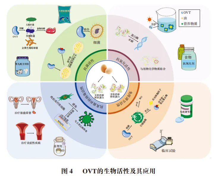 OVT具有的抗菌活性使得其可以作为婴儿配方奶粉成分治疗急性腹泻。此外,OVT还可以作为一种包装成分进行食品保鲜,以延长食品的保质期(图4)。Seol等开发了一种与EDTA结合的OVT抗菌膜,并将其用作具有抗菌特性的包装材料,通过抑制大肠杆菌来延长新鲜鸡胸肉的保质期。OVT还可以运输抗生素以形成OVT-抗生素复合物的载体。研究表明,由转铁蛋白受体介导的OVT内吞作用可用于将药物直接递送给病原体或细胞内感染细胞。OVT作为抗生素和天然防腐剂的新型安全替代品,其优异的抗菌活性能够广泛用于医药、包装材料和食品工业。