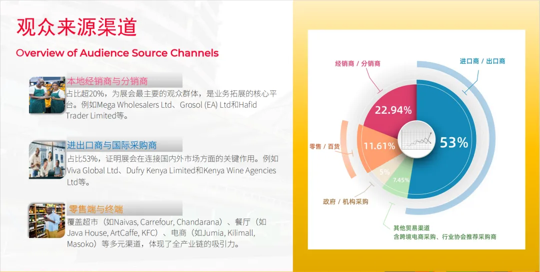 占比53%,证明展会在连接国内外市场方面的关键作用。例如Viva Global Ltd、 Dufry Kenya Limited和Kenya WineAgenciesLtd等。