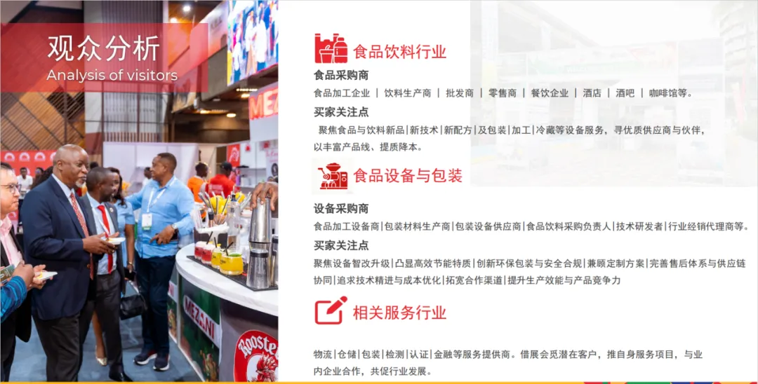 食品加工设备商|包装材料生产商|包装设备供应商|食品饮料采购负责人|技术研发者|行业经销代理商等。