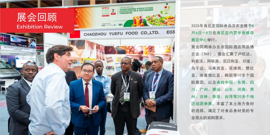 2025年肯尼亚国际食品及农业展于8月6日-8日在肯尼亚内罗毕肯雅塔展览中心举行。展会同期举办东非国际酒店用品博览会(THX)。展会汇聚了卢旺达、科索沃、阿联酋、尼日利亚、印度、乌干达、马来西亚、菲律宾、赞比亚、埃塞俄比亚、韩国等10多个国