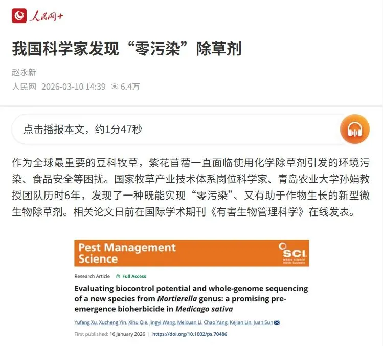 【编者按】3月10日,人民网以“我国科学家发现‘零污染’除草剂”为题报道国家牧草产业技术体系岗位科学家、青岛农业大学孙娟教授团队历时6年,发现了一种既能实现“零污染”、又有助于作物生长的新型微生物除草剂。