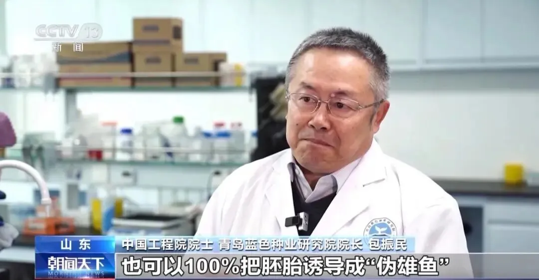 中国工程院院士 青岛蓝色种业研究院院长 包振民:现在这套技术,也可以100%把胚胎诱导成“伪雄鱼”,而且可以正常发育,产生成熟的精子。
