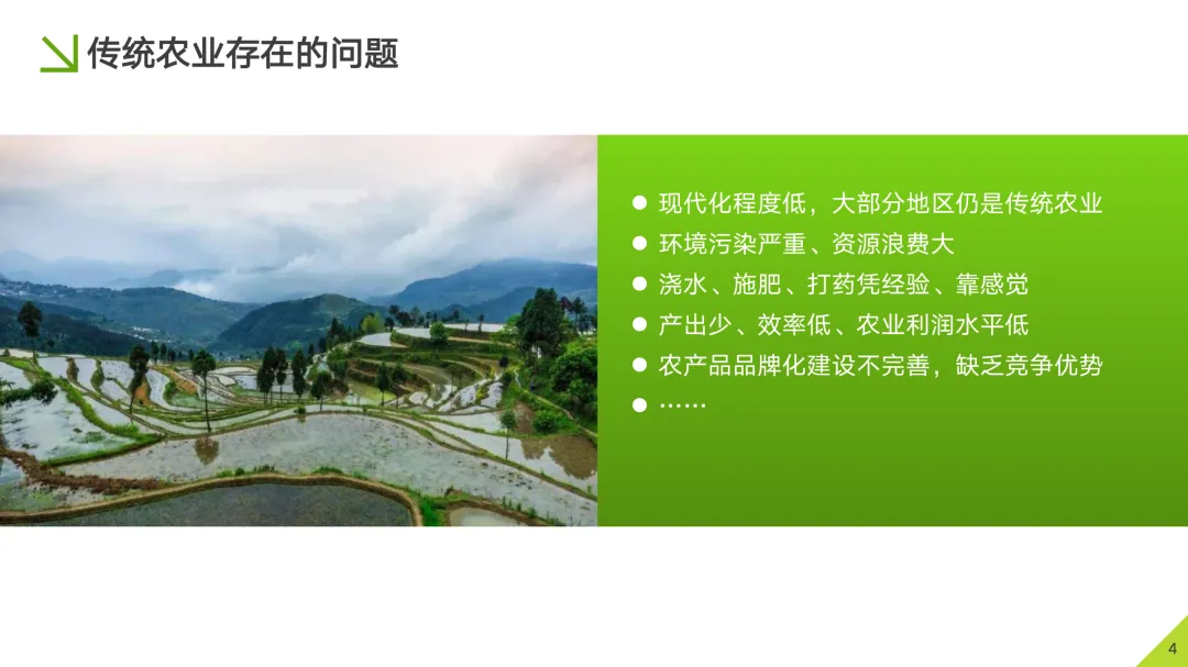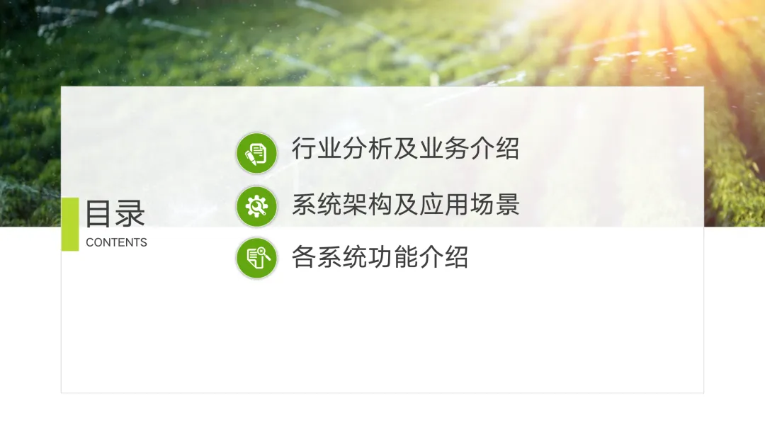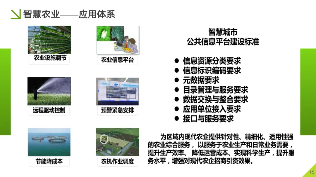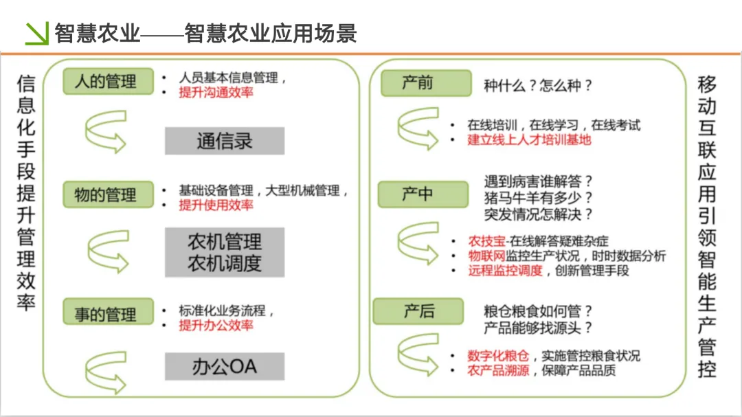 服务内容体系化:围绕 农业生产经营、精准化生产、网络化服务、农副产品溯源 以及 跨界农业服务 五大核心应用方向,构建丰富的应用生态。