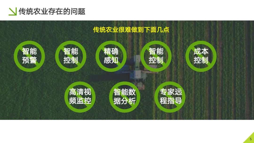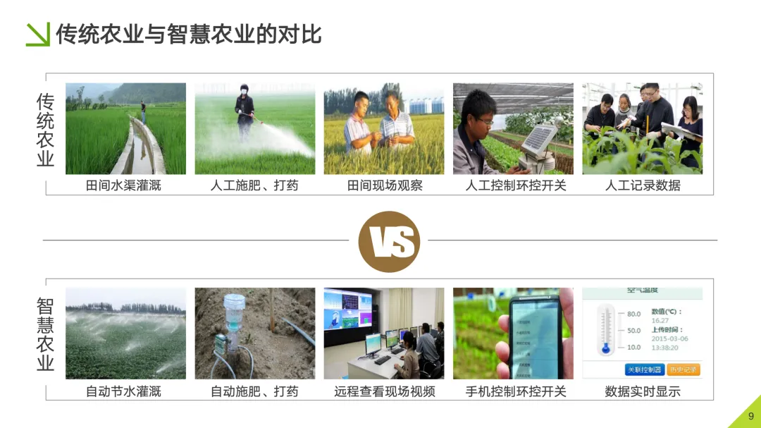 传统农业:田间水渠大水漫灌,人工肩背手撒进行施肥打药,管理者需亲临现场观察作物,手动操作环境控制开关,所有数据依靠纸质记录。
