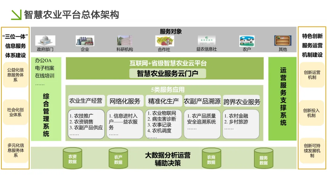 服务对象全覆盖:平台需同时服务于政府部门、农业企业、科研机构、合作社、家庭农场等多元主体。