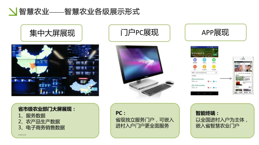 平台的信息呈现也应是多维立体的:为管理决策者提供宏观数据可视化的指挥中心大屏;为专业农技人员提供功能全面的PC端业务门户;为一线生产管理者提供便捷高效的移动APP,实现信息与服务的随时随地触达。