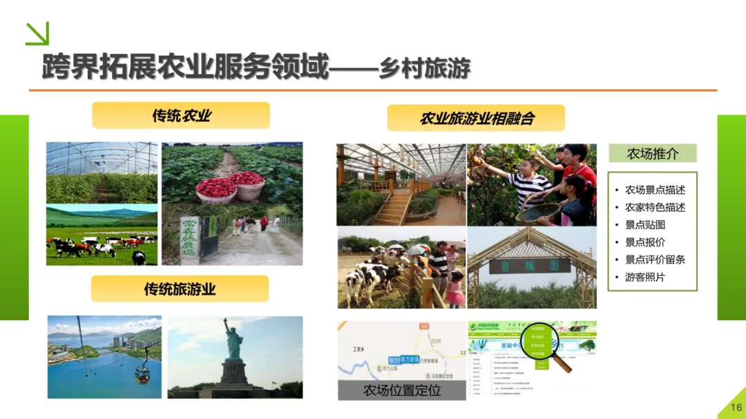 智慧乡村旅游服务:将特色农场、田园景观、农耕文化进行线上整合与推介,提供景点导览、在线预订、游客互动等功能,推动农旅融合,创造新的经济增长点。
