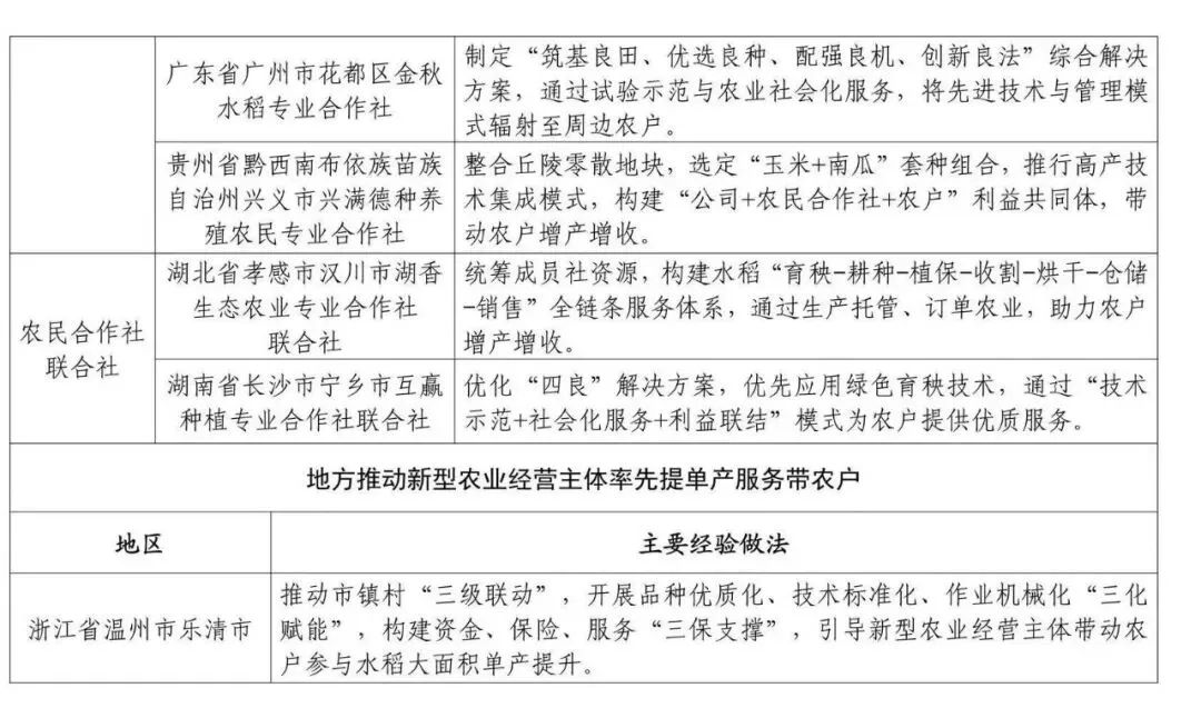 近年来,各地贯彻落实党中央、国务院决策部署,聚焦粮食稳产丰产,发动新型农业经营主体率先提单产服务带农户,围绕当地主导产业完善农业经营体系,涌现出了一批可复制、可推广的经验做法,现予以总结推介。