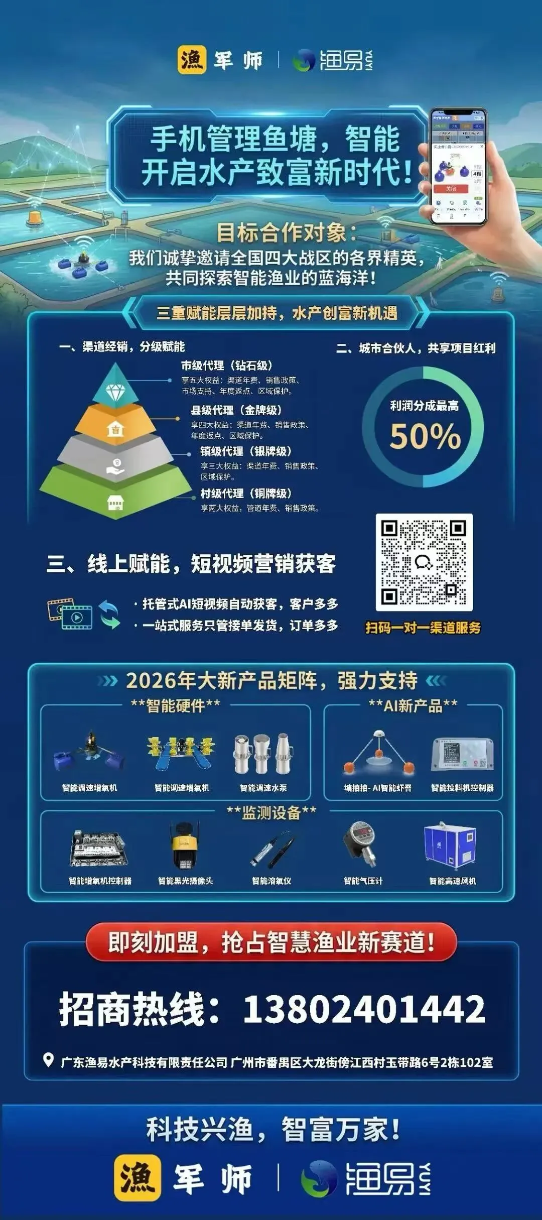 在水产养殖领域,传统模式依赖经验、劳动强度大、管理粗放、风险高、效益低的痛点长期制约产业发展,转型升级需求迫切;而物联网、大数据、AI技术的突破性应用,让智慧渔业成为破局关键——通过“自动化调控、精准化监测、智能化决策”,实现养殖效率与附加值的跃升,开辟出万亿级市场空间。叠加国家“数字乡村”“智慧农业”政策东风,多地出台专项扶持资金与技术推广政策,为智慧渔业发展注入强心剂。在此背景下,渔易水产科技有限责任公司旗下品牌渔军师以“智慧渔业新赛道、合作共赢创富业”为核心,推出创新合作模式,为从业者打开科技兴渔新大门。