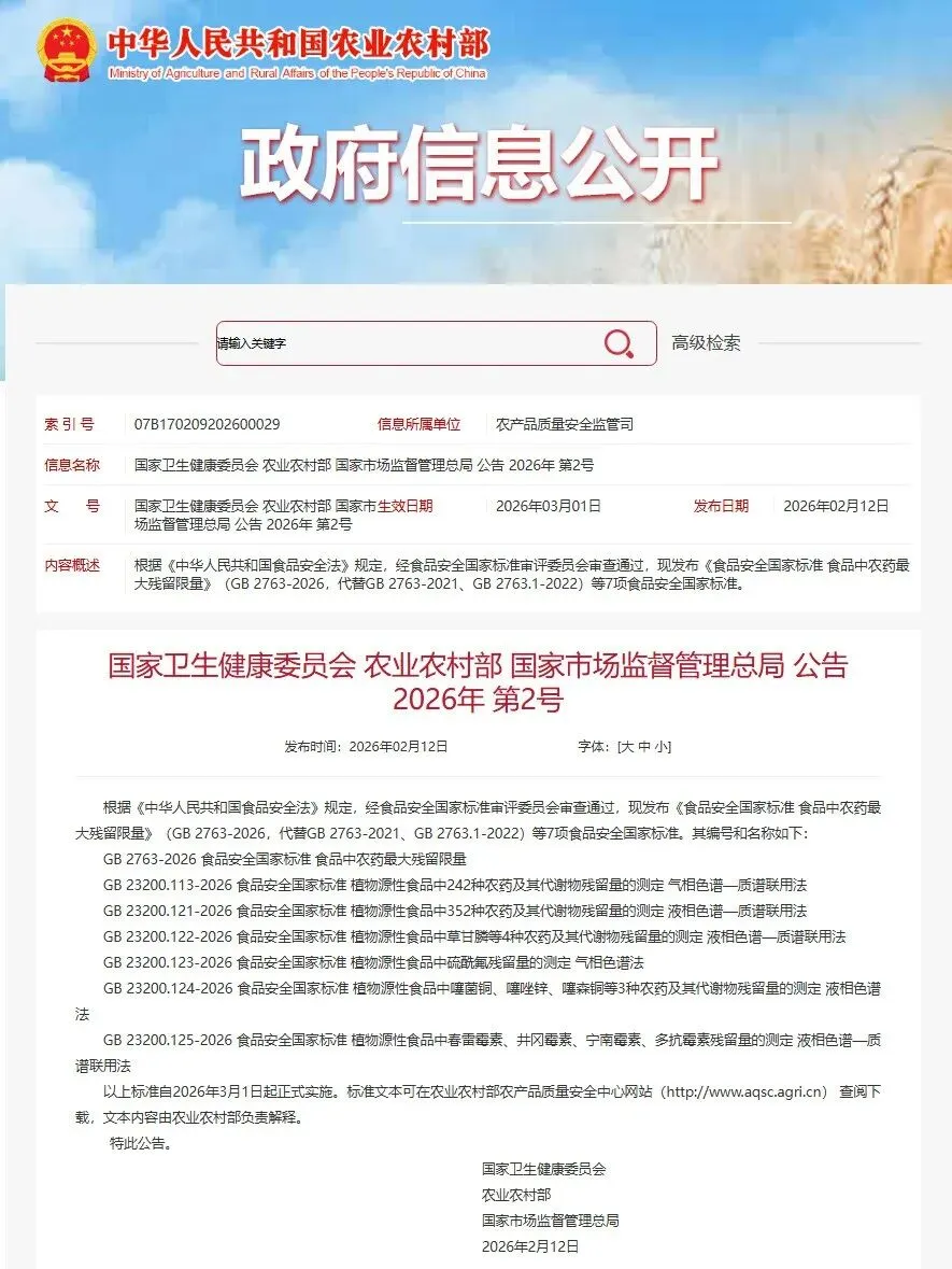 以上标准自2026年3月1日起正式实施。标准文本可在农业农村部农产品质量安全中心网站(http://www.aqsc.agri.cn) 查阅下载,文本内容由农业农村部负责解释。