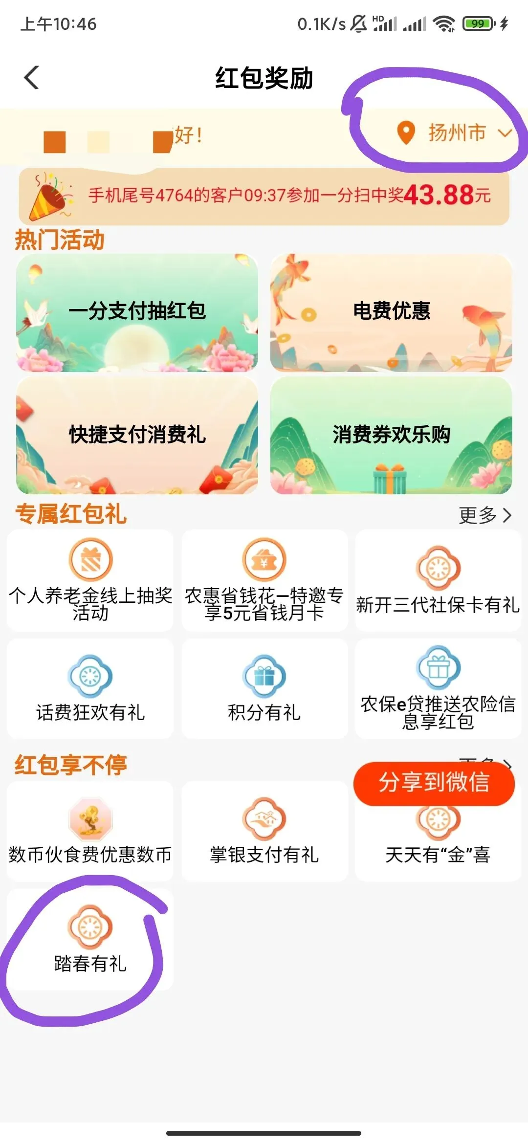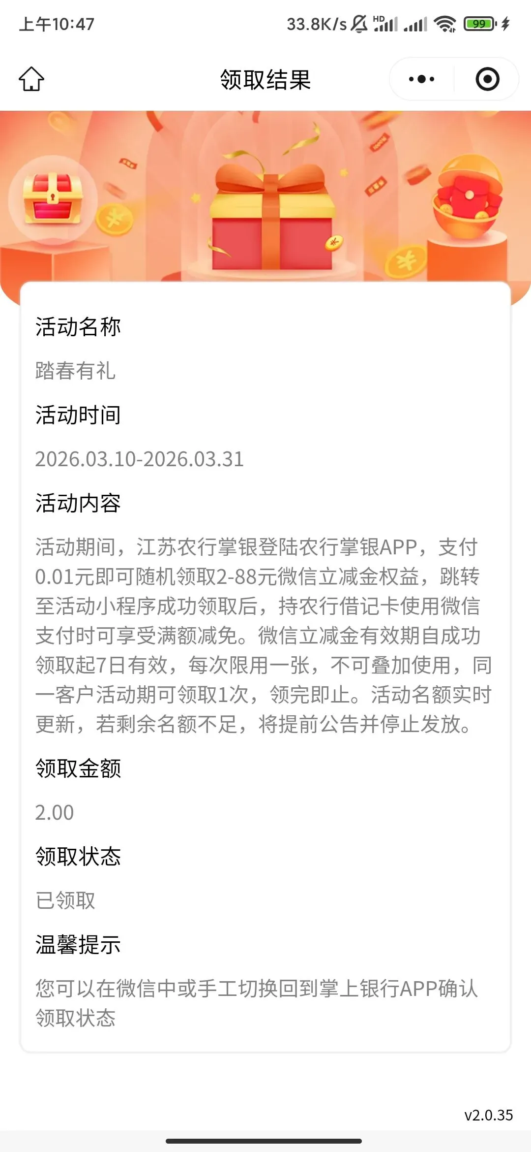 >江苏农行支付0.01随机领取2-88元微信立减金