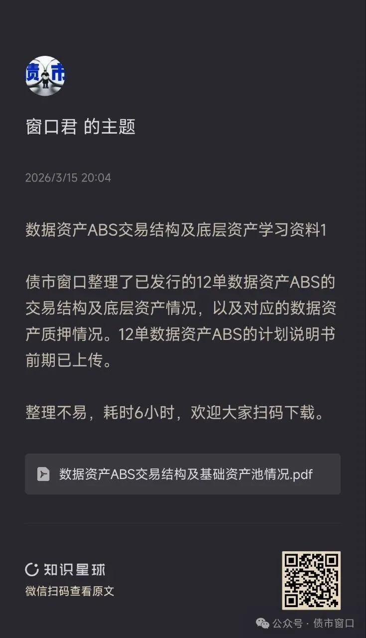 2026年3月12日,湖州城市集团农副产品物流集散中心持有型不动产绿色资产支持专项计划(乡村振兴)获批,获批额度为5.5亿元。该项目2025年12月1日申报,贴标绿色和乡村振兴两大品种。根据公开信息查询,本次ABS的底层资产——湖州城市集团农副产品物流集散中心,是湖州市农业开发集团有限公司(湖州城投子公司)运营的大型现代化农批市场,位于湖州东部高铁新城区块,占地352.2亩,包含冷链物流、市场交易和生活配套三大功能区。现在越来越多的物业租金类的底层资产采用类REITs或者REITs的形式申报了!现在除了REITs产品之外,最火热的资产证券化产品当属数据资产ABS了!债市窗口总结了当下最火热的数据资产ABS的交易结构和资产池情况,可扫码下载查看。债市窗口在知识星球上传了已发行的12单数据资产ABS案例的交易结构汇总,还有底层资产及数据资产明细情况,欢迎扫码下载。2、债市窗口总结了2026年债券承销业务审核的重点支持方向