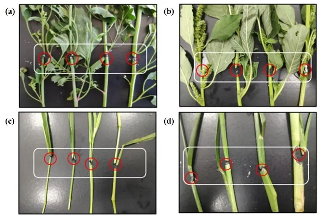 图1 (a)-(d)藜、刺苋、狗尾草、牛筋草被激光照射后的结果[1]