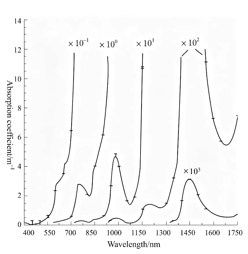 图4 水在400nm-1750nm波长的吸收系数[4]