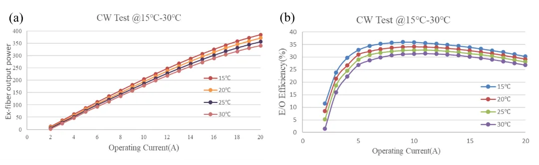 如图 6 所示,在 15℃–30℃冷却温度区间内,模块输出功率始终保持在 300 W 以上,电光转换效率超过 26%,展现出优异的功率稳定性与能量利用率。得益于自主可控的芯片与封装工艺,产品在宽温域、宽电流范围内均具备可靠的工作特性。
