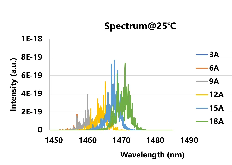 此外,该产品光谱宽度(FWHM)<6 nm,在3A-20A的工作电流范围内均展现出良好的光谱特性与波长稳定性,进一步保障了除草作业的精准度,为激光除草的高效、稳定开展提供了多重技术保障。