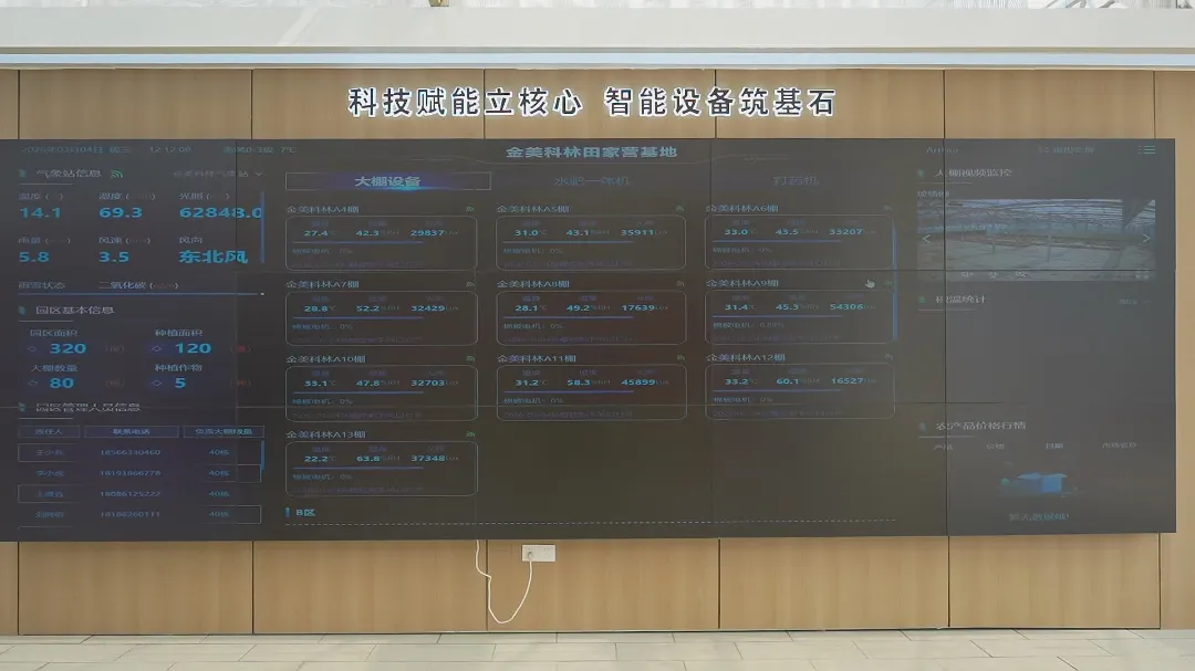 金美科林(湖北)科技股份有限公司田家营基地创新中心主任 苏伟这边就是物联网设备,可以监控每个大棚的湿度、光照温度和其他信息,同时可以在手机上远程操控通风口、棉被这些开关操作,还有水肥一体打药机,也都接入这个控制系统,坐在家里就能远程遥控,这边是摄像头,你可以远程看每个大棚里面的状况。