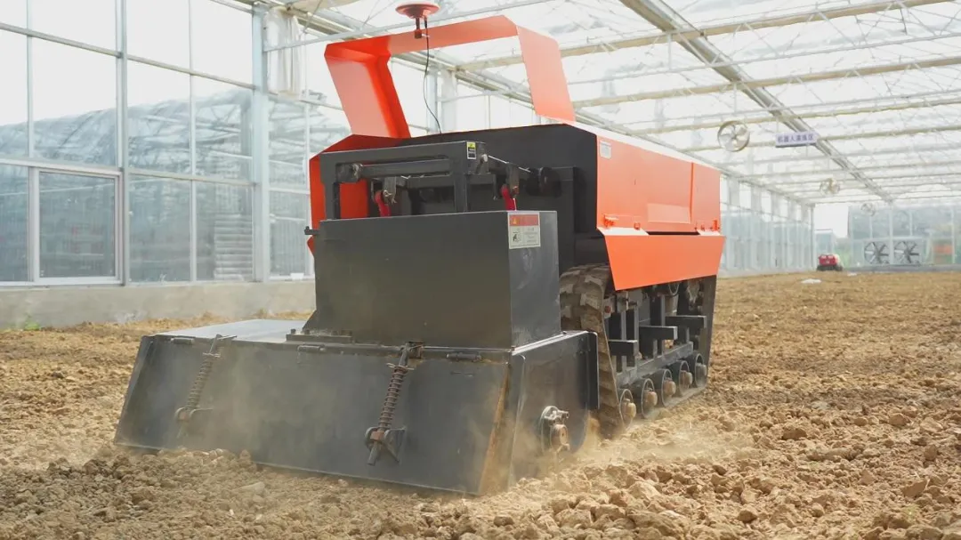 走进金美科林田家营基地,连片智能大棚在春日里整齐排列,创新中心主任苏伟正在启动AI自动履带式旋耕机器人进行旋耕作业。