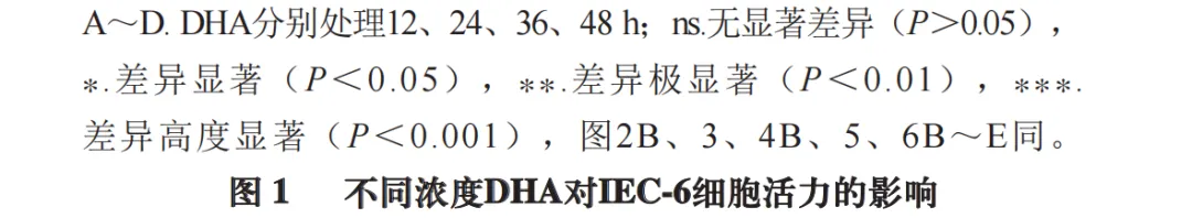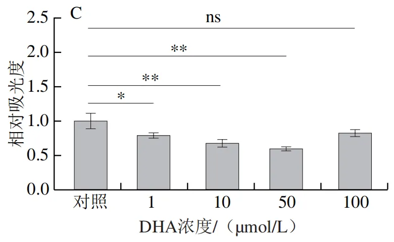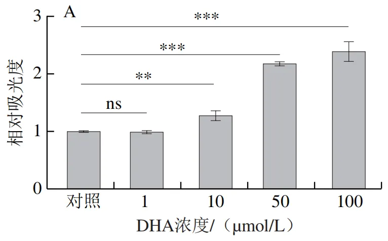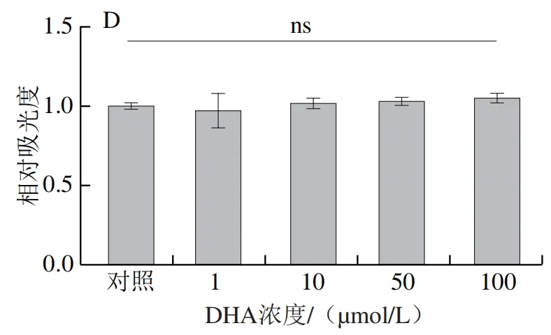 IEC-6细胞在传代后8~10 h完成贴壁,约15 h恢复正常形态,24~48 h进入对数生长期,36 h后增殖逐渐减缓。因此,选择传代24 h后的细胞,分别采用DHA处理12、24、36、48 h,以评估其增殖活力。由图1A、B可知,与对照组相比,经DHA处理12 h和24 h后,IEC-6细胞活力显著升高(P<0.01、P<0.001),且呈浓度依赖性增强,尤其是100 μmol/L DHA处理24 h后,细胞活力提升将近4 倍,表明DHA可在24 h内明显促进IEC-6细胞增殖。由图1C、D可知,处理36 h后,细胞增殖受到抑制;处理至48 h时,细胞活力与对照组无显著差异。