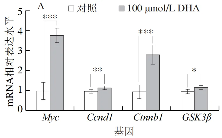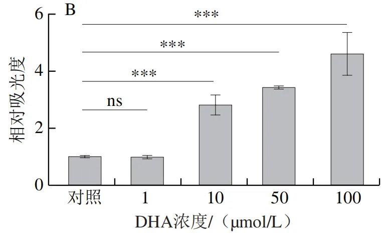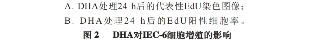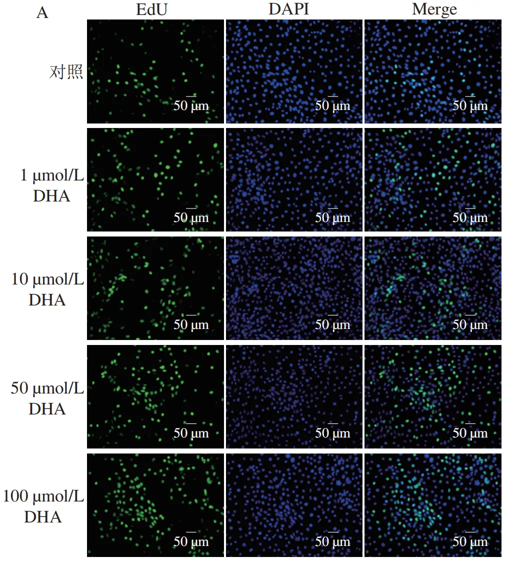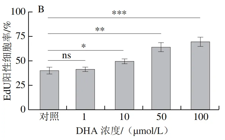 为验证CCK-8结果,进一步采用EdU染色法检测细胞增殖情况。由图2可知,DHA处理24 h后EdU阳性细胞率显著提高(P<0.05、P<0.01、P<0.001),且具有浓度依赖性,与CCK-8结果一致。因此,选取促增殖效果最显著的100 μmol/L DHA进行后续机制研究。
