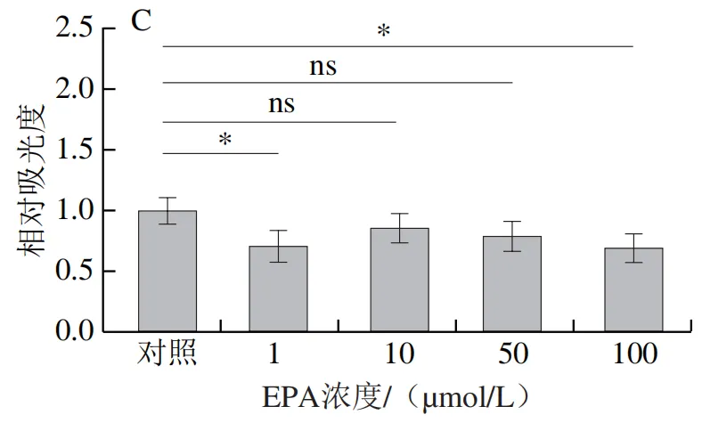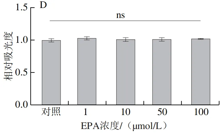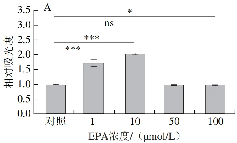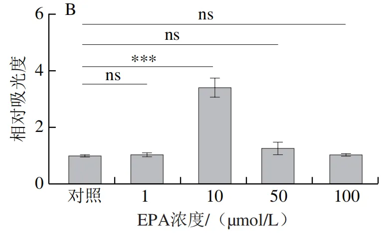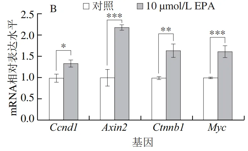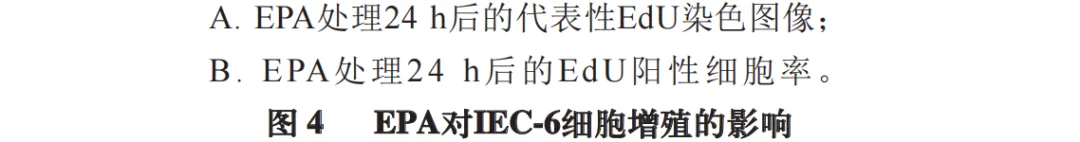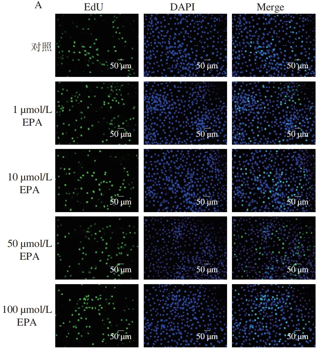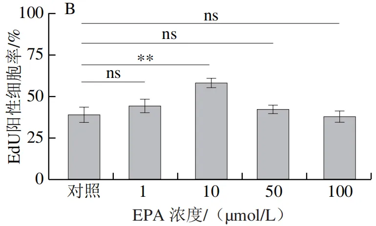 由图3可知,10 μmol/L EPA处理12 h和24 h可显著促进细胞增殖(P<0.05、P<0.001),特别是处理24 h后,细胞活力提升3.5 倍;EPA处理36 h和48 h后,细胞活力也普遍与对照组无显著差异,与EdU染色结果(图4)一致,进一步证实10 μmol/L EPA在24 h内促进增殖效果最优,故选用该浓度进行后续机制研究。