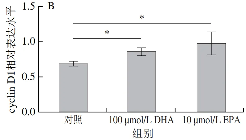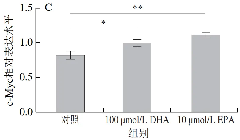 其次,通过CCK-8与EdU实验双重验证,本研究确认DHA和EPA对IEC-6细胞具有明确的促增殖作用,且2 种方法所得数据一致性较高,结果可靠。值得注意的是,DHA和EPA的最佳促增殖浓度存在差异:DHA为100 μmol/L,而EPA为10 μmol/L,这可能源于二者分子结构及代谢途径的不同。作为更长链的脂肪酸,DHA可通过影响细胞膜结构(如脂筏组装)调控膜相关信号转导,从而更高效地促进细胞增殖;而EPA则可能通过其代谢产物(如类二十烷酸和消退素)发挥抗炎与促增殖作用。例如,EPA衍生的前列腺素E3可通过激活前列腺素E受体促进增殖,而DHA更倾向于调控磷脂酰肌醇3-激酶/蛋白激酶B(phosphatidylinositol 3-kinase/protein kinase B,PI3K/Akt)等信号通路。未来研究可进一步解析DHA与EPA在细胞内的代谢差异及其对增殖调控的具体机制。