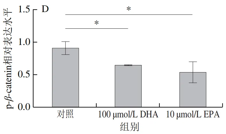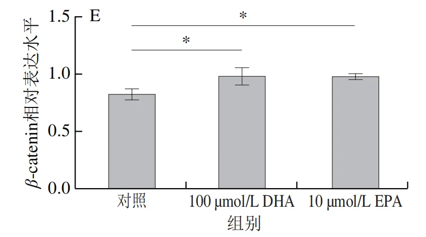 WB分析进一步表明,2 种处理均能显著增加cyclin D1、β-catenin和c-Myc的蛋白相对表达水平,并降低p-β-catenin相对表达水平(图6A),这与蛋白条带灰度分析结果(图6B~E)一致。以上结果说明,DHA和EPA可通过激活Wnt/β-catenin信号通路促进IEC-6细胞增殖。