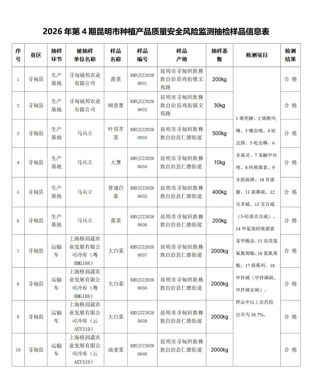 根据《中华人民共和国农产品质量安全法》和《农产品质量安全监测管理办法》规定,昆明市农业农村局对昆明市辖区内的种植户开展了2026年第4期种植产品质量安全风险监测,现将监测情况公告如下: