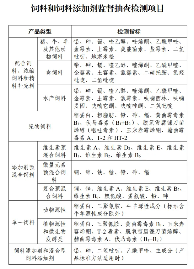 检测项目详见附件3,检测方法、判定依据和判定原则见附件4。质量指标包括粗蛋白、维生素、氨基酸等;卫生指标包括铅、砷、真菌毒素等;兽药及非法添加物指标包括允许使用的抗球虫药物,喹烯酮、地塞米松等。