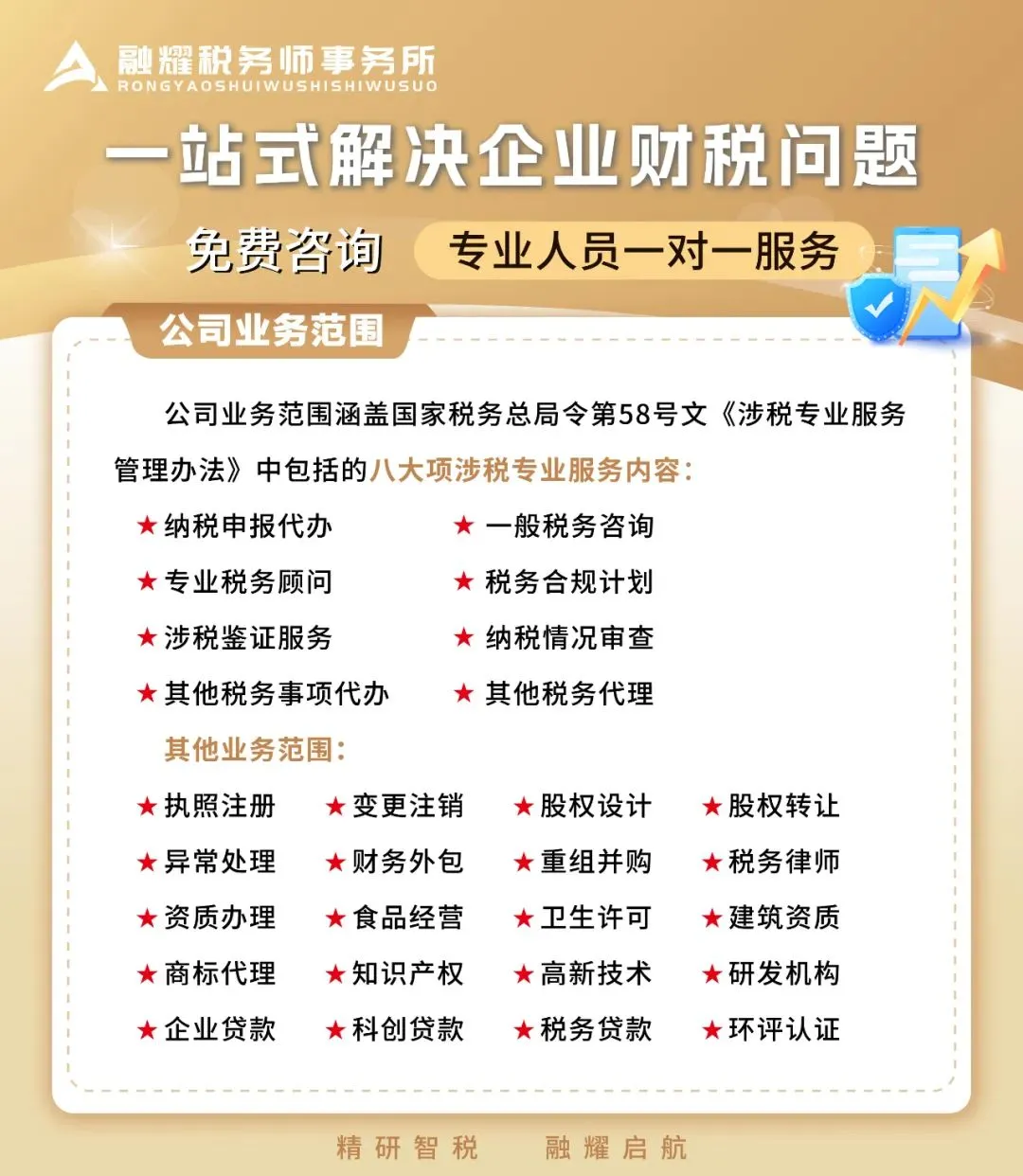 融耀税务师事务所,作为定州市本地第一家针对中小型企业税务服务机构,凭借专业的税务师团队与完善的财税服务体系,在行业内独树一帜。 我们专注于为各行业客户量身定制税务合规计划,同时提供全面的涉税服务,涵盖涉税鉴证、税务稽查应对、税务审计、涉税风险评估、创业咨询、财税指导及税务培训等领域。无论是复杂的涉税疑难问题,还是日常财税咨询需求,我们都能为您提供专业、高效的解决方案。电话:13473127127