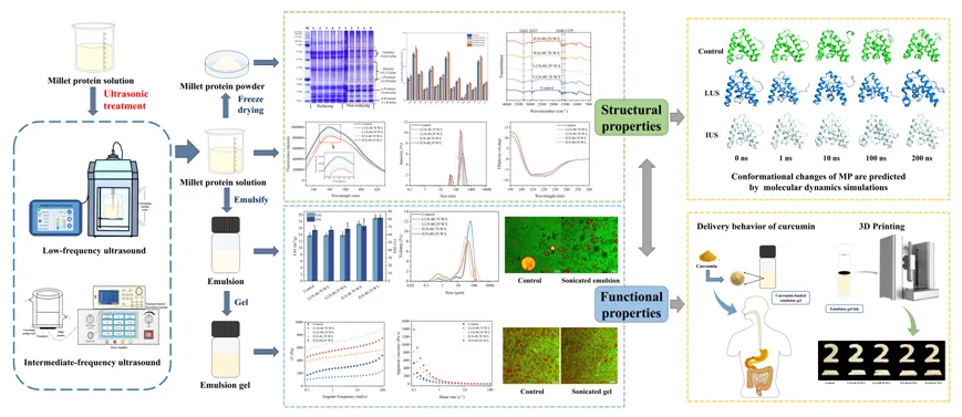 近期,南京农业大学食品科学技术学院吴越副教授与陈志刚教授在国际食品TOP期刊Food Chemistry(中科院一区, IF = 9.8)发表题目为“Low- and intermediate-frequency ultrasound modification of millet protein: Implications for emulsifying and gelling properties”的研究性论文。本文第一作者为南京农业大学博士研究生马艳蓉,陈志刚教授、吴越副教授为通讯作者。本研究重点探讨了不同超声波频率(20 kHz和207 kHz)和功率密度(48.70 和80.29 W/L)对小米蛋白的结构、理化和功能特性的影响。在此基础上,利用AlphaFold3可视化不同频率处理下小米蛋白的构象变化以及探究小米蛋白乳液凝胶在3D打印和活性物质递送方面的应用潜力。这项研究深入了解超声波的物理和声化学效应如何影响小米蛋白的分子机制,从而影响其功能特性和应用。