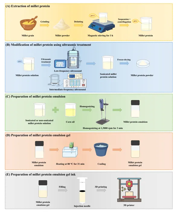 图1.小米蛋白制备、超声改性小米蛋白、乳液、乳液凝胶和乳液凝胶油墨的制备过程