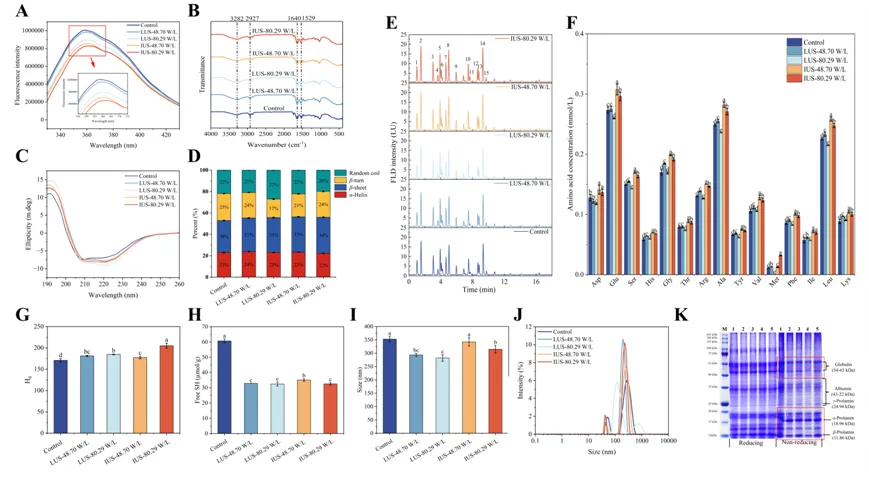 图2.不同超声频率和功率密度对小米蛋白结构特性的影响