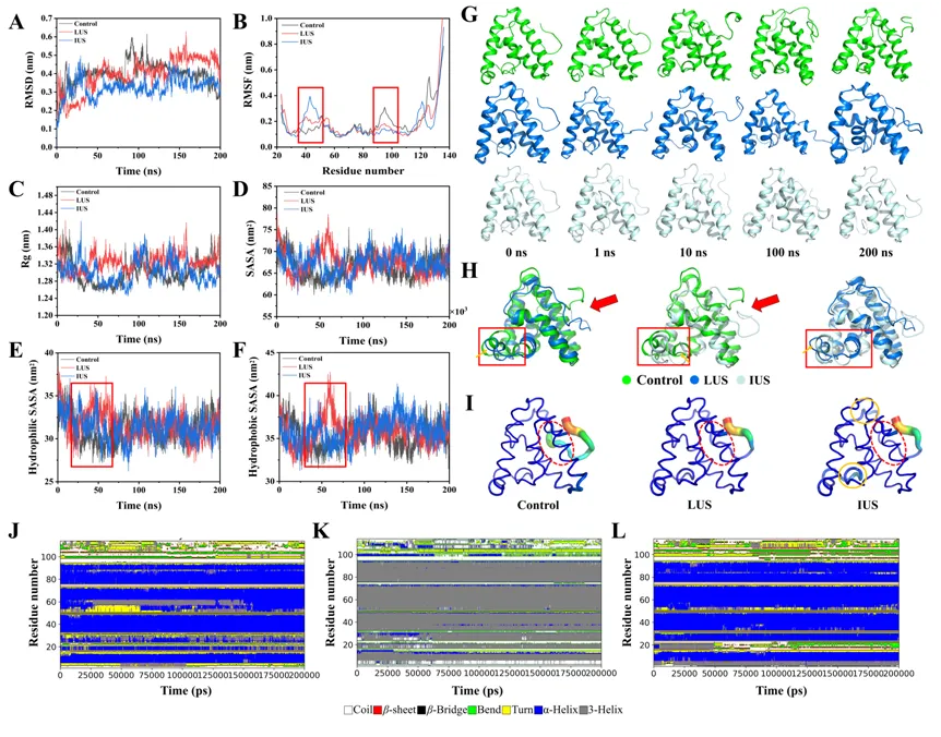 图3.未超声、低频超声和中频超声修饰的小米蛋白分子的分子动力学模拟分析