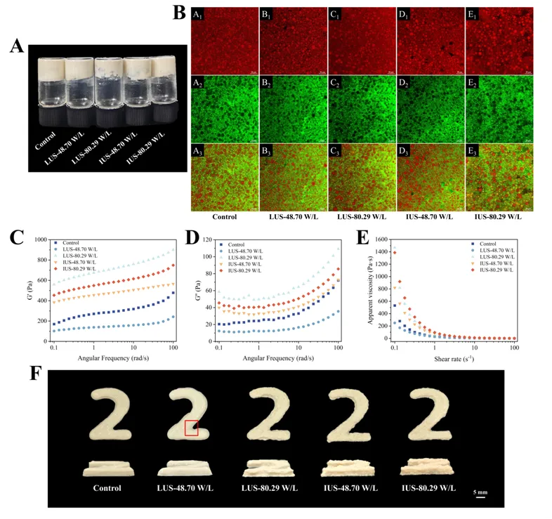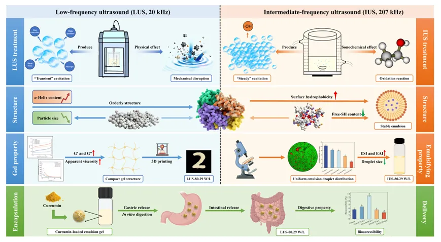 本研究系统地研究了功率密度为48.70 W/L 和80.29 W/L的低频(LUS)和中频(IUS)对小米蛋白(MP)的结构和功能特性的影响,特别侧重于基于乳液凝胶的3D食品打印和姜黄素体外递送应用。超声处理诱导MP的二级和三级结构发生显着构象变化,同时保留一级结构。声空化破坏了非共价相互作用,导致游离巯基含量减少和表面疏水性增加。FTIR分析证实了向富含β-折叠结构的转变,同时伴随着α-螺旋含量的减少,表明超声波诱导的蛋白质解折叠和重组。这些构象变化促进了热诱导交联的增强,分子动力学模拟进一步证明了分子灵活性和二级结构转变的增加。因此,MP的功能性能得到了显著提高。超声波处理减小了乳液液滴尺寸,促进了油水界面上的蛋白质吸附,经IUS处理的样品表现出优异的乳化性能。与此同时,更致密、更具内聚力的凝胶网络的形成显著改善了流变性能。值得注意的是,LUS-80.29 W/L表现出最佳的凝胶强度和表观粘度,从而具有出色的3D打印性能。相比之下,IUS改性MP由于其增强的界面活性而表现出更适合乳化系统。除了结构和流变学方面的增强之外,经LUS处理的MP还可以有效递送姜黄素,延迟其在胃部条件下的释放,同时促进肠道释放并提高生物可及性。这些发现建立了清晰的频率依赖性结构-功能关系,使得能够合理选择超声条件以针对特定应用定制MP功能。总体而言,这项工作提供了对超声介导的蛋白质工程的基本见解,并强调MP作为先进食品结构和靶向生物活性递送的有前途的平台。未来的研究应探索协同超声辅助修饰策略,优化可扩展应用的关键加工参数,并将这种方法扩展到其他生物活性化合物,以进一步评估其营养和健康影响。
