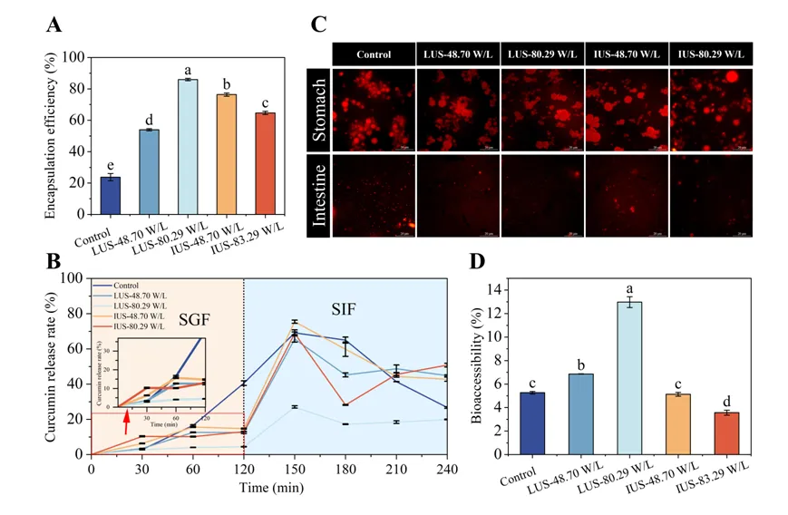 图6.不同超声频率和功率密度对小米蛋白乳液凝胶递送特性的影响