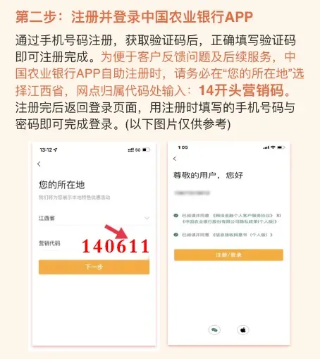 2.为便于客户反馈问题及后续服务,中国农业银行APP自助注册时,请在所在地选江西,输入代码140611。