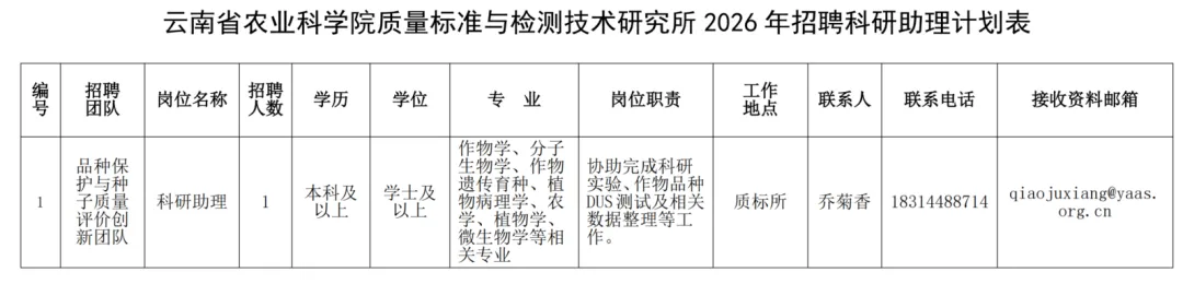 >(转云南农科院官网)云南省农业科学院质量标准与检测技术研究所2026年科研助理招聘公告
