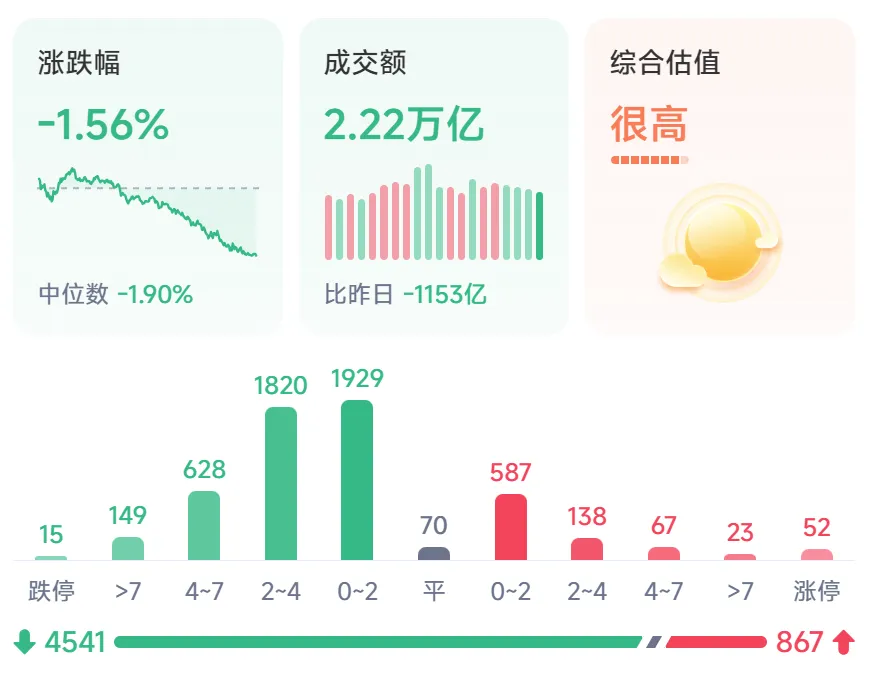 今天行情一路向下,超过4500家企业下跌,中位数下跌1.9%,成交量目前还有2.22万亿。