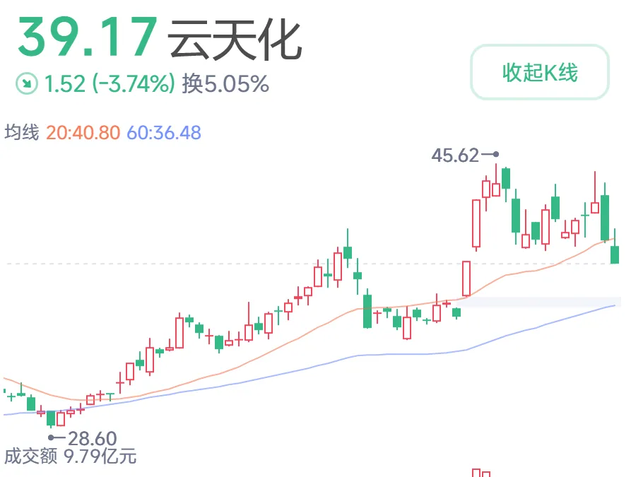 云天化最近回调了一些,从最高45.62元到今天收盘的39.17元。