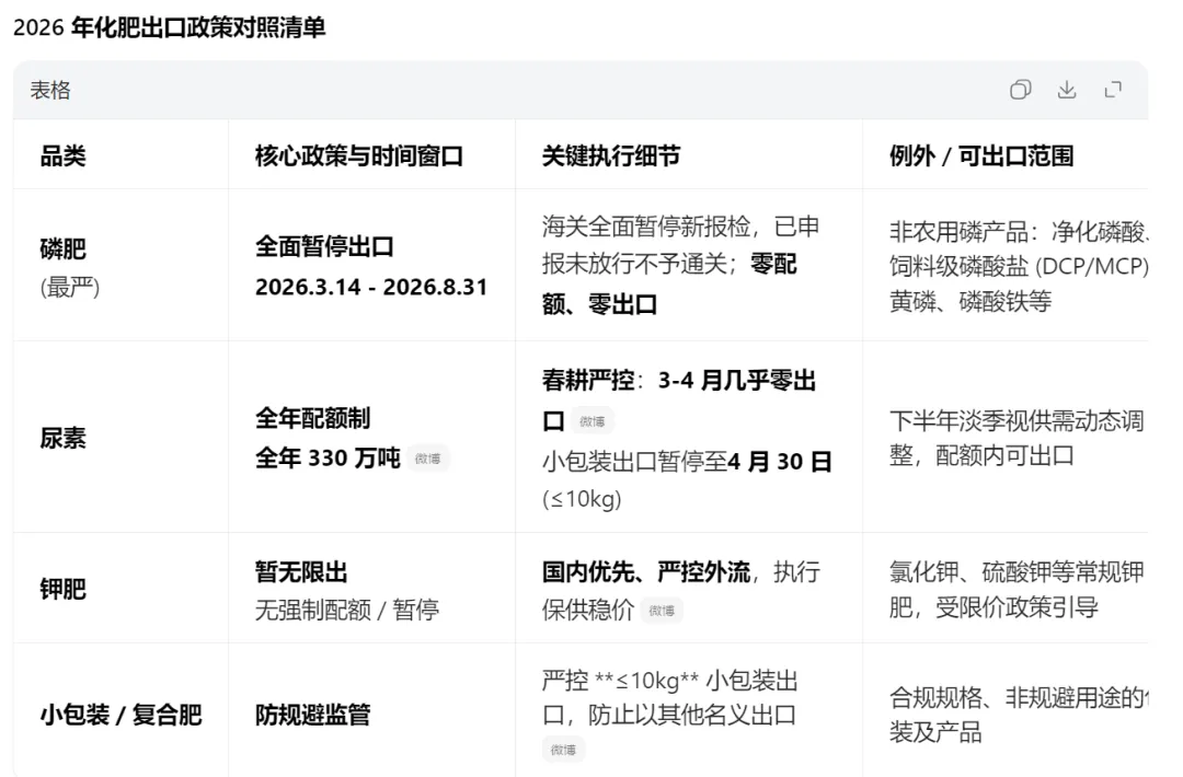 2026-03-14 至 2026-08-31,中国全面暂停农用磷肥及含磷肥料出口。
