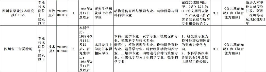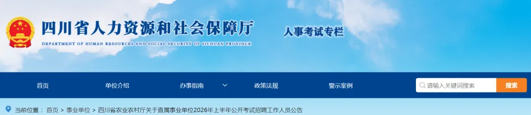 根据《事业单位公开招聘人员暂行规定》《四川省事业单位公开招聘工作人员实施办法》等规定,四川省农业农村厅直属事业单位面向社会公开考试招聘事业单位工作人员,现将有关事项公告如下:面向全国招聘2026年7月31日前取得国民教育相应学历和学位,并完全符合《四川省农业农村厅直属事业单位2026年上半年公开招聘工作人员岗位和条件要求一览表》(以下简称《岗位和条件要求一览表》)相关岗位条件要求和本公告其他要求的人员。其中,2026年高校应届毕业生应当于2026年7月31日前毕业并取得相应学历学位证书,其他人员应当在面试资格审查截止前取得相应学历学位证书。未在规定时间内取得有关证书的,不得进入下一环节或不得聘用,责任由应聘人员承担。2.遵守宪法和法律,拥护中国共产党领导和社会主义制度;6.符合法律法规及相关政策规定及招聘岗位要求的其他资格条件。4.被依法列为失信联合惩戒对象的人员,最高人民法院公布的失信被执行人,国家有关部委联合签署备忘录明确的失信情形人员;5.尚未解除党纪、政务处分或正接受纪律审查、监察调查的人员;6.按照《事业单位人事管理回避规定》《事业单位公开招聘人员暂行规定》《四川省事业单位公开招聘工作人员实施办法》等相关规定应当回避的人员;7.试用期内的机关事业单位工作人员;未满机关最低服务年限5年(含试用期)的新录用公务员(含参照《公务员法》管理人员);处于国家和我省政策规定最低服务期内的事业单位工作人员;9.法律法规政策规定不得聘用为事业单位工作人员的其他情形人员。具体岗位和条件见《岗位和条件要求一览表》。有关报考政策规定、报名网络技术等事宜详见《报考指南》。报考者对《岗位和条件要求一览表》中有关岗位的专业、学历、学位、工作经历等资格条件有疑问时,可直接咨询招聘单位。本次招聘采取网络报名方式。报名时间为2026年3月17日10∶00至3月24日8∶00。报名网站为四川省人力资源和社会保障厅官网“人事考试”专栏(https://www.scpta.com.cn/)。1.岗位选择。应聘人员登录报名网站,查阅公告、岗位一览表、报考指南等,了解报考要求,选择与自己条件相符的招聘岗位,使用有效身份证件有关信息进行报名,并且只能选择报名系统中一个岗位。报名时填报的身份证件信息与考试时使用的身份证件必须保持一致。2.填报信息。应聘人员按网络提示要求通过注册,真实、准确、完整填写《2026年上半年四川省事业单位公开招聘工作人员报考信息表》或《2026年上半年四川省公开招聘中小学教师报考信息表》(以下简称《报考信息表》,其中教师招聘报考信息表只针对省属部门)的各项内容。应聘人员须下载照片审核处理工具(在《报考信息表》上传照片处下载)进行照片处理,并按网络提示上传照片。报名照片将用于准考证、考场座次表等,请上传时慎重选用。对恶意注册报名信息,扰乱报名秩序或者伪造、变造有关证件、材料、信息骗取考试资格的,按有关规定严肃处理。温馨提示:为方便外地考生参加公共科目笔试,本次招聘网上报名时,新增了“重庆市中心城区”考点供考生选择。凡招聘岗位仅需考生参加《公共基础知识》《综合能力测试》两个科目笔试的,报名时可选择在“重庆市中心城区”考区参考。需参加《教育公共基础》《卫生公共基础》(含中医)《卫生公共基础》(不含中医)或专业科目笔试的考生只能在四川省参考,不能在重庆市中心城区参考。应聘人员报名时应签署诚信承诺书,承诺所提供的信息真实准确,并承担不实承诺责任。招聘单位及主管部门不得以任何理由拒绝符合条件的人员报考。3.查询资格初审结果。应聘人员请于2026年3月17日10∶00至3月25日8∶00期间,登录报名网站查询是否通过资格初审(如对资格初审结果有异议,可咨询招聘单位或主管部门)。资格初审不合格的,可于报名时间截止前改报其他符合条件的岗位。应聘人员应慎重选择报考单位及岗位,资格初审通过后,不得更改报考单位及岗位等报考信息。资格初审合格的应聘人员,请于2026年3月26日8:00前登录报名网站确认缴费(按照四川省发展和改革委员会、四川省财政厅《关于全省人力资源社会保障部门行政事业性收费的通知》川发改价格规〔2023〕473号规定笔试1科缴费50元)。网络报名后未在规定时间内确认缴费者,视为自动放弃。确认缴费的具体程序按网络提示进行。缴费成功后,非政策性因素,不予退费。符合申请办理减免考务费用的应聘人员,参照附件3《报考指南》进行办理,未在规定时间内办理减免手续的,视为自动放弃考务费减免。确认缴费人数与招聘名额之比达到3:1方可开考。在报名缴费工作结束后,对达不到开考比例的岗位,由四川省农业农村厅根据报名情况相应缩减或取消该招聘岗位招聘计划,并于2026年3月31日18:00前在报名网站公告。取消岗位的,所缴费用按照原支付路径退回。完成确认缴费(含减免费用)的应聘人员,请于2026年4月21日至4月24日登录报名网站打印本人准考证(使用A4纸打印,黑白、彩色均可,保证字迹、照片清晰)、《报考信息表》二份(供面试资格审查时使用),并在考试当天持本人准考证和有效身份证件,到指定的考点参加考试。过期身份证和身份证复印件不得作为参加考试证件。无准考证不准进入考场。资格审查工作由招聘单位