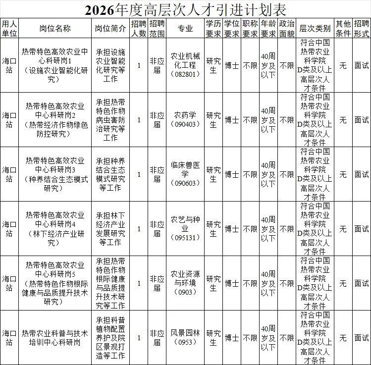 根据各院属单位岗位需求,拟引进人才岗位包括中国热带农业科学院C类及以上高层次人才、中国热带农业科学院D类及以上高层次人才和全国重点实验室第四层次及以上人才三个类别。