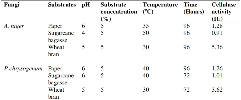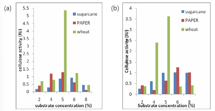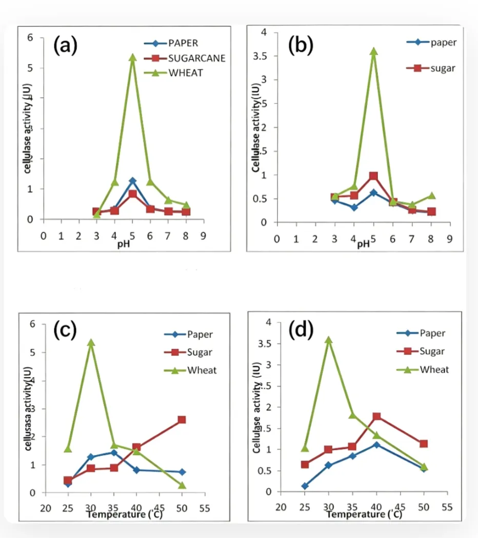 结果显示在 pH=5、温度30℃、麦麸浓度 5%的条件下能使两种菌株的纤维素酶活性达到最优, 在上述条件下 , 麦麸被证明是生产高活性纤维素酶的最佳底物。本文亮点以农业废料资源化为目标,将废弃生物质转化为高价值的纤维素酶,实现变废为宝。可以参考本文,从低成本、常见的农业废弃物入手,也可以在其基础上拓展:增加新的菌种、采用正交试验、响应面法等优化方法,深入探索最佳条件。这项研究为农业废弃物制纤维素酶提供了基础工艺依据,但同时也存在一些不足: