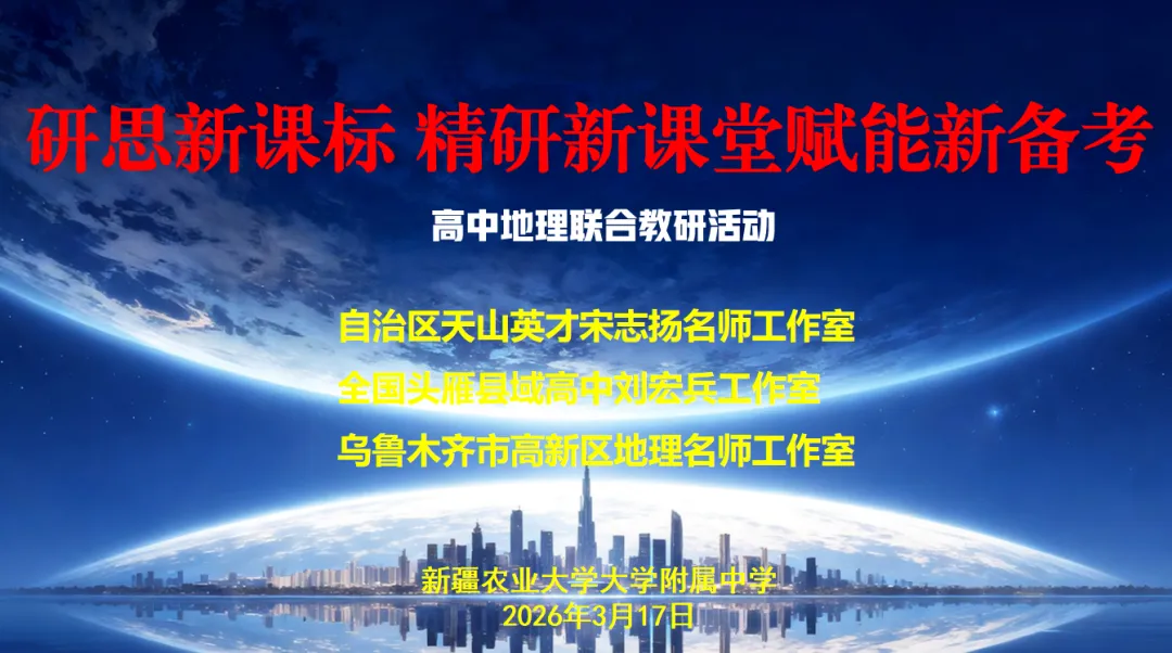 2026年3月17日,由自治区天山英才宋志扬名师工作室牵头,联合全国头雁县域高中刘宏兵工作室、乌鲁木齐市高新区地理名师工作室,在新疆农业大学附属中学成功举办“研思新课标 精研新课堂 赋能新备考”高中地理联合教研活动。三大地理名师工作室成员、兵团和地方各校高中地理骨干教师齐聚一堂,共研课标新变化、共探课堂新路径、共商备考新策略,整场教研活动干货满满、氛围浓厚,为新疆高中地理教学高质量发展注入了强劲动力。