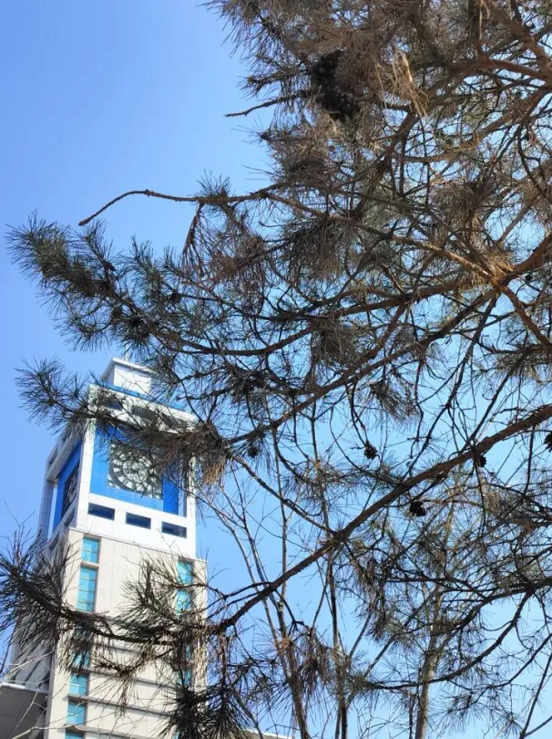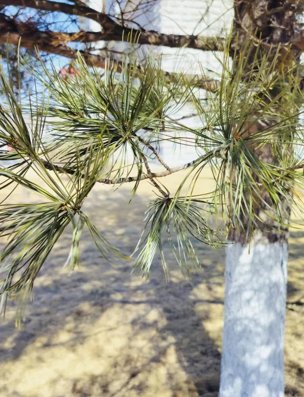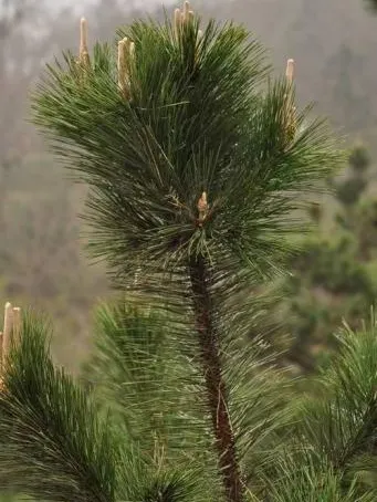 形态特征:常绿乔木,高达25米。树冠卵形至广卵形,老树皮黑褐色,鳞片状开裂,上部树皮褐黄色或淡黄色,薄皮脱落。叶两针一束,粗硬,扭曲,花期5–6月。小球果下垂,绿色,翌年9–10月成熟,球果长卵形,黄绿色或灰黄色。
