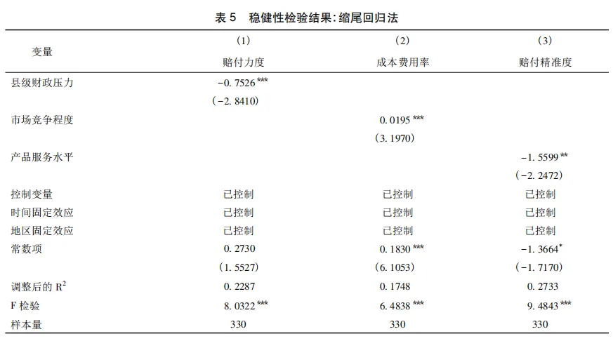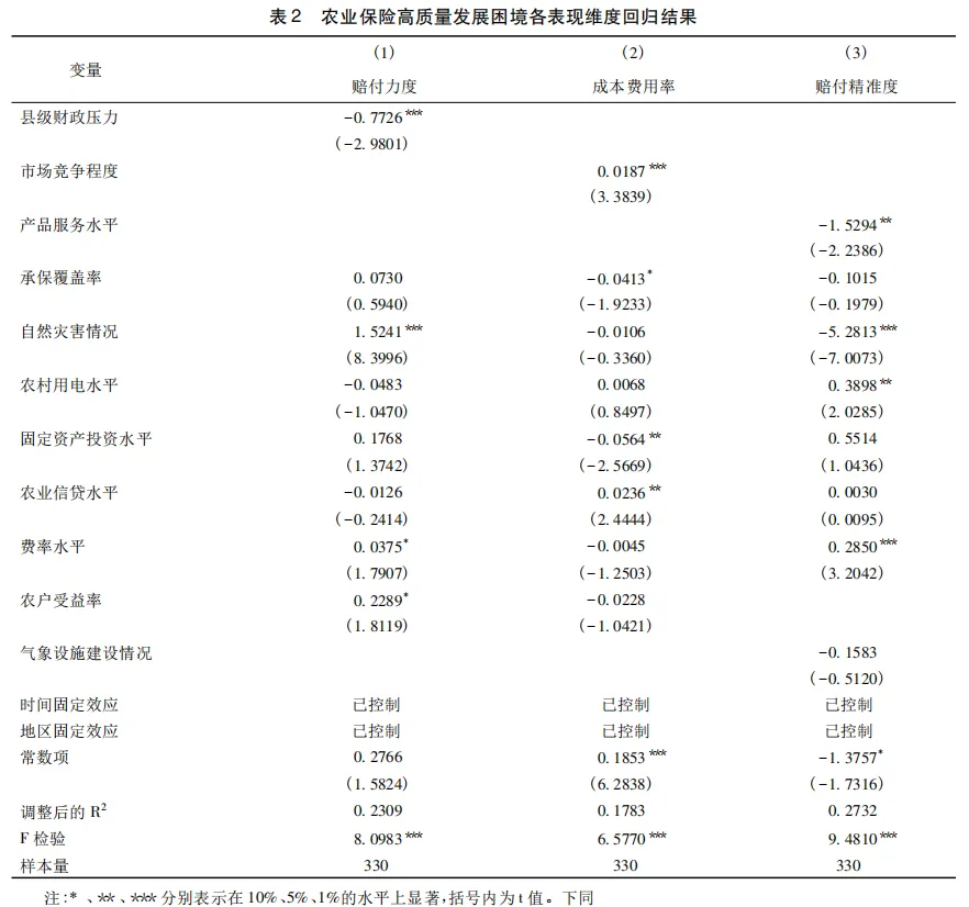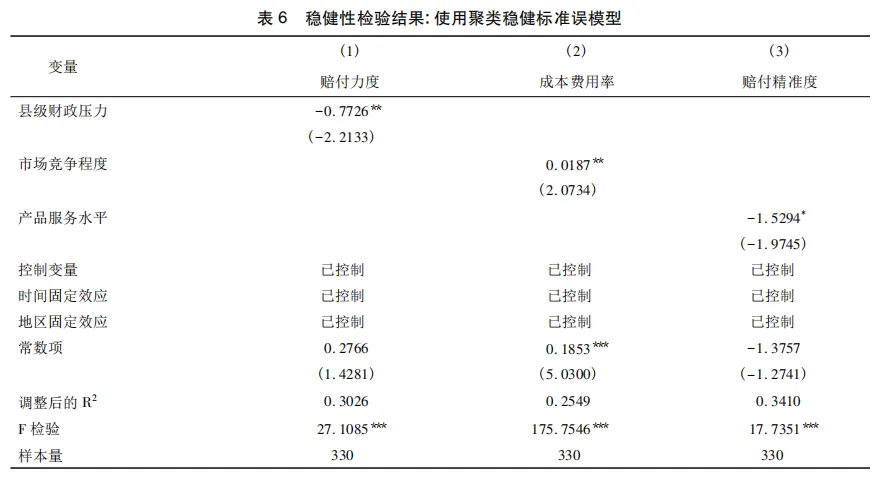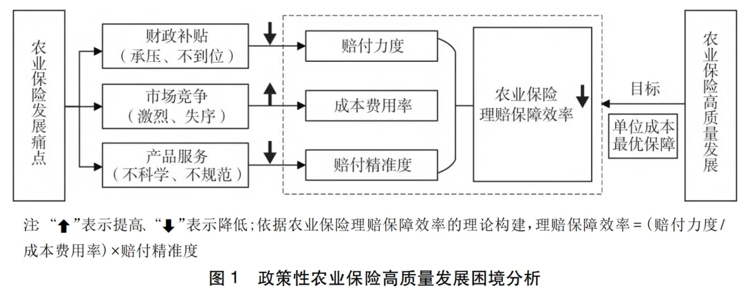 4.财政补贴承压、市场竞争失序、产品服务水平不足的叠加作用进一步降低农业保险理赔保障效率。农业保险高质量发展表现为成本费用与赔付力度、赔付精准度转化的动态优化过程,而根据系统论观点,系统中的要素并非独立,而是通过相互关系影响系统运行及效率。从农业保险系统的实际运行看,财政约束刚性化、市场竞争过度化、产品服务粗放化的发展痛点,还会进一步通过叠加催化机制为问题的放大滋生土壤,使得农业保险系统陷入弱态均衡的路径锁定状态。第一,财政压力引发的补贴延迟、应收保费、费率控制等问题,既会使得激烈竞争下保险机构成本错配问题进一步凸显,又弱化业务经营与产品创新的长期投入意愿,进一步降低单位成本与赔付精度的转化效率;第二,市场竞争失序导致非生产性成本费用提升,既削弱财政补贴资金配置效率,同时通过资源挤占效应削弱产品创新所带来的边际收益激励,进一步加剧对理赔力度、精准度的抑制作用;第三,产品的不科学性、服务实施的不规范性降低理赔效率,同时为财政压力与市场竞争下农业保险业务经营的扭曲行为提供空间,进一步削弱单位成本赔付力度。最终加大与“以最小成本实现最优化风险保障”的农业保险高质量发展思路的偏离程度,使得整体系统“规模不经济”的效率损失状态进一步恶化,风险转移、损失补偿的核心功能难以真实发挥,产业风险不断累积、社会福利净损失持续扩大,对农业生产稳定性与可持续发展构成严重威胁,由此,本文提出如下研究假说: